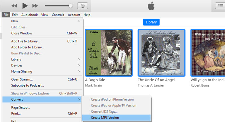 - Select the M4B files in Audiobooks, and go to iTunes menu: File > Convert > Create MP3 Version.