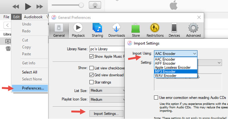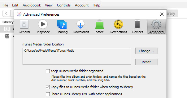 - iTunes preferences setting on Windows: Menu-Edit-Preferences (Ctrl+,).