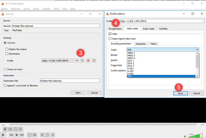 We don't advise beginners to customize the output formats as there are some video and audio codecs only wrapped by particular containers, but VLC media player won't exclude the incompatible video codecs from the available codec lists. This may lead to plenty of errors. For instance, you are allowed to choose the VP8 codec when you choose MP4 as the capsule format, but VP8 should only be included d in the WebM container. Finally, you're going to get an unplayable video file.