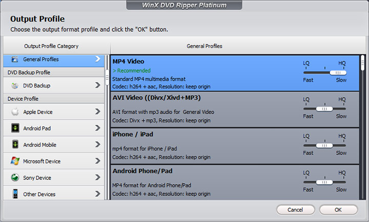 As for the outputs, different from MakeMKV, WinX DVD Ripper offers more output formats, including MP4 (H.264/HEVC), AVI, WMV, MPEG, and MOV. But unexpectedly, WinX DVD Ripper cannot output video in MKV format. The DVD backup profile will give back an MPG video, which may be a little troublesome when playing.