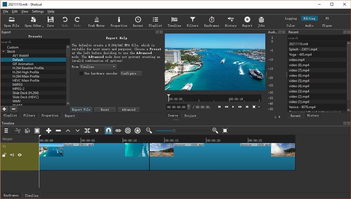 Step 5. In the Presets window, you will find a bunch of video and audio formats used for exporting the file. You can simply choose the Default option, because it will require Shotcut to create a H.264/AAC MP4 file, which can work for almost all platforms, including YouTube.