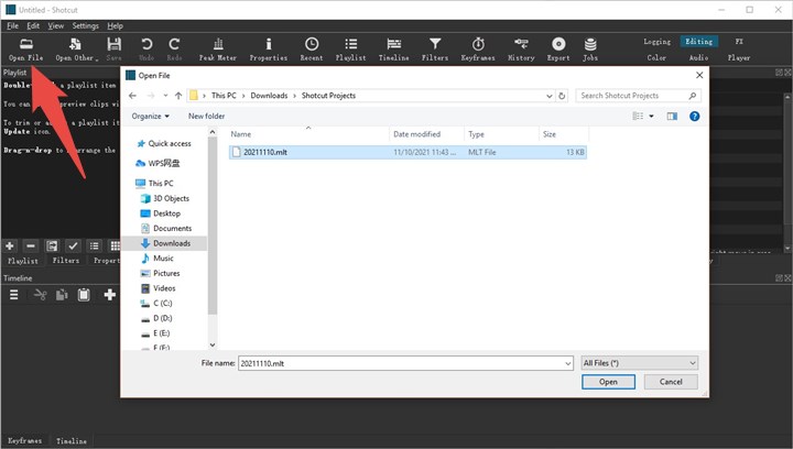 Step 2. After you open Shotcut, find the Open File menu on its interface, locate the MLT file, and then open it.