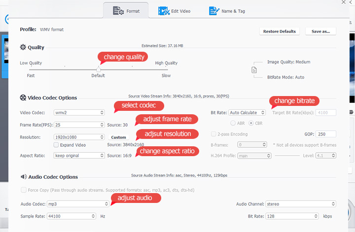 If necessary, you can hit the codec Option button to go to the Format panel and then adjust the resolution, frame rate, quality, and a few other properties for getting the output with the desired properties. Uncheck Auto Copy and hit Run to start converting MOV to WMV with this best video converter.
