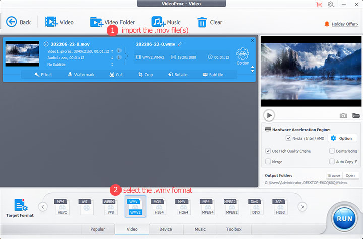 Simple, speedy, yet powerful in features, VideoProc Converter AI is the best overall method to convert MP4 to WMV. The support for 370+ formats ensures it can handle MOV files that come with a variety of codecs, including ProRes, Cinepak, MPEG4, H.264, and H.265. It's also ideal for anybody who wants to convert from one to another while getting the best possible quality, thanks to the adoption of Next Generation Codecs, Interpolation Algorithm, and a variety of other advanced techs.