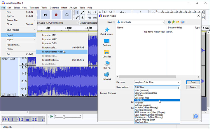 The following instructions show how to use Audacity to convert MP3 to FLAC.