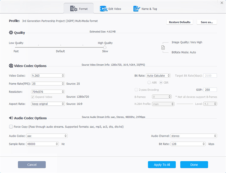 - Customizable 3GP settings: codec, frame rate, resolution, bitrate…