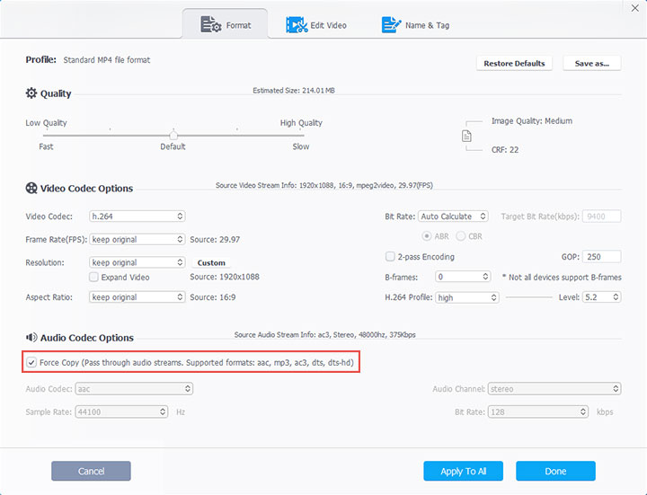 To remux MP4 to MKV, click the gear icon named Option. In the pop-up window, set all Video Codec Options to "keep original". In Audio Codec Options, check the box of "Force Copy". Then click "Done" to save your choice. You can also use the MKVMaker from Toolbox to pass through the video and audio stream.