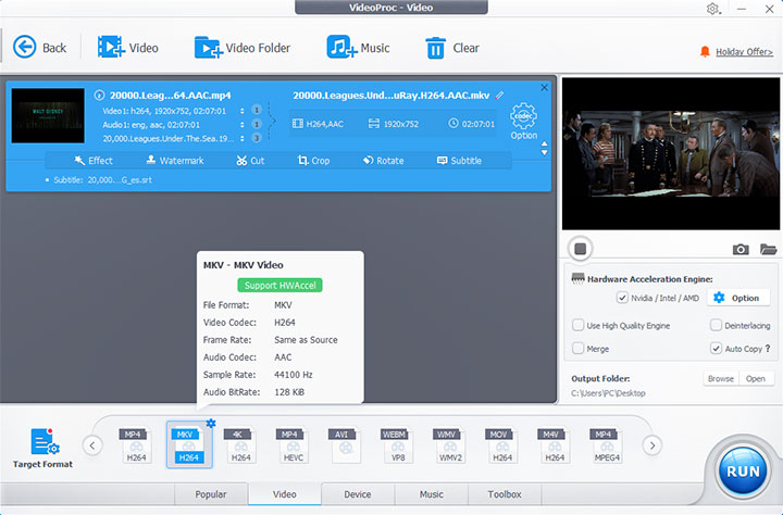 You can use VideoProc Converter AI to convert MP4 to MKV. First, launch VideoProc Converter AI, and click the "Video" button on the interface to load MP4 file(s) to the program. Select MKV as the output format. You can also click the "Subtitle" button to add multiple subtitle tracks. Finally, click "RUN" to start converting MP4 to MKV.