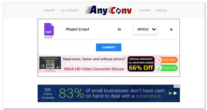 Anyconv lets you convert MP4 under 100MB to MPEG formats like MPEG4 and MPEG2 as well as other popular video formats. It's free of charge and won't add any annoying watermark.