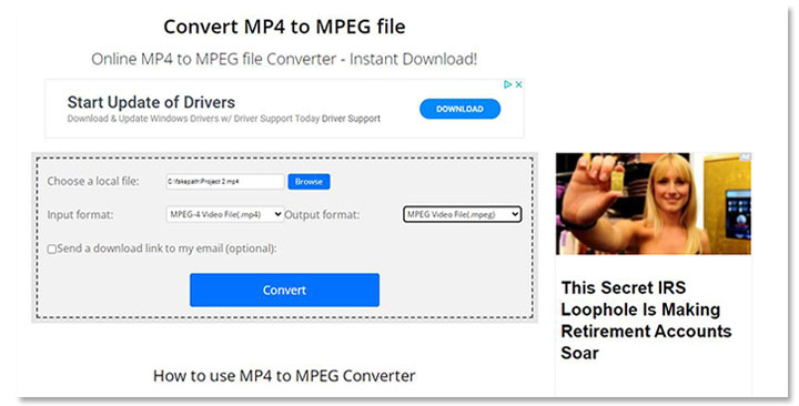 With the capability of converting video of up to 250MB to MPEG without requiring you to pay or sign up, ConvertFiles is one of the most generous online and free video to MPEG converters. However, it offers very limited functions. You cannot utilize ConvertFiles to convert MP4 to MPEG2 or MPEG4 and customize the codec properties.