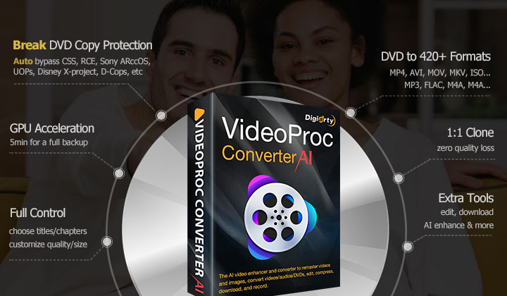 VideoProc Converter AI is the best tool on earth for removing the DVD copy protection, and for good reasons. It's capable of removing CSS, RCE, Disney 99-title, and all other kinds of copy protection from old and recent DVDs. The self-explained interface and the support of the level-3 hardware acceleration tech ensure a beginner can get everything done in minutes. Moreover, it's an all-in-one video processing program, allowing you to 1:1 copy DVD to ISO file, convert 420+ video and audio formats, and apply basic edits to videos, etc.