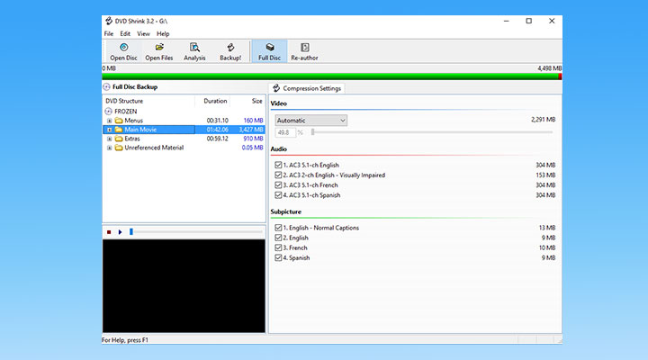 Navigate to the Compression Settings section and select your preferred compression ratio. If you want to compress the content in the copy-protected DVDs to fit on a DVD5 disc, then choose Automatic. By default, all audio tracks and subtitles are selected. You can uncheck any tracks you do not need to make the output file smaller in size.