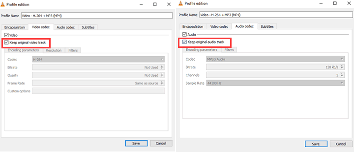 Step 5. Hit Video codec, and check Keep original video track. Hit Audio codec and check Keep original audio track. Afterward, click Save to confirm the changes.