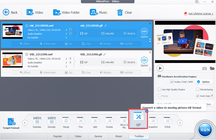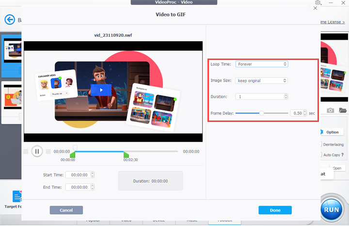 Either you prefer the handy workflow of online converters or the high-quality output of desktop programs, VideoProc Converter AI can meet all your needs. When it comes to converting SWF to GIF, it completes batch conversion at a blazing-fast speed. Meanwhile, it offers many options to customize GIF loop time, dimensions, duration, and delay time.
