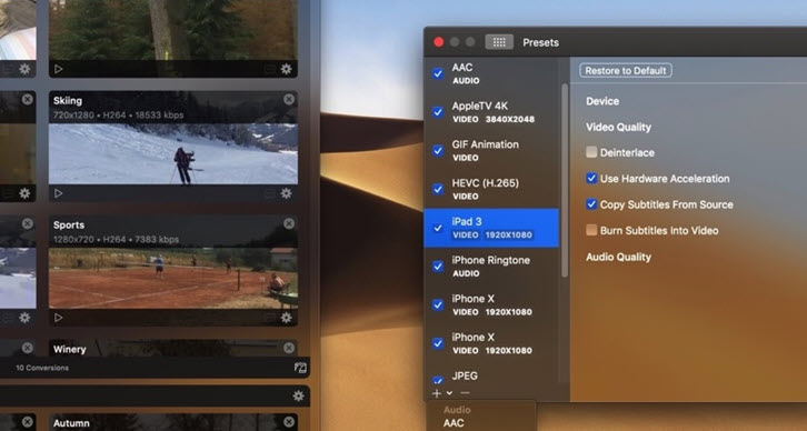 The ability to export video in a batch is another feature that wins the heart of the techie. After adding multiple videos from Mac Finder to Handbrake, you can select the conversion mode and queue the task.
