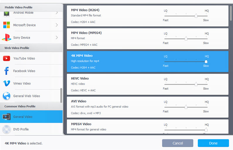 Manageable codec settings to configure more: upscale 1080p to 4K, change frame rate, manage quality for different needs, tweak bitrate sittings.