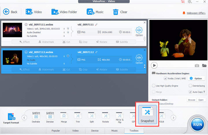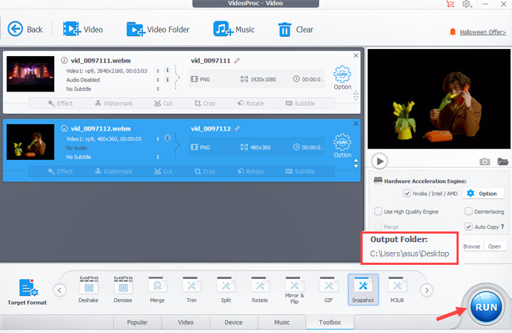 Step 4. Move to the "Output Folder" option from which you can find the PNG images after conversion. You are also allowed to customize a path for it. Then hit "RUN" to convert WebM to PNG in VideoProc Converter AI.
