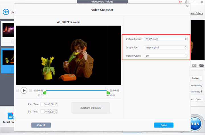Step 3. Drag the green knobs to specify the part that you want to extract PNG pictures from. Select "PNG" in Picture format. Choose "keep original" in Image Size. Set a target picture count. Click "Done".