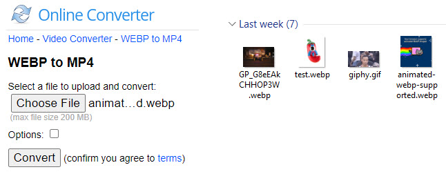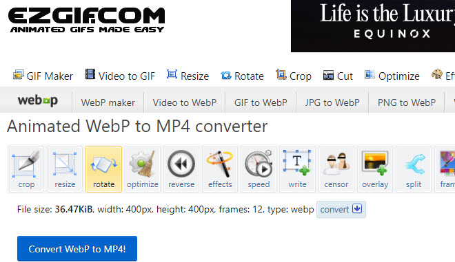 As suggested by its name, EZGIF is built to offer easy solutions for GIF related processing, such as making animated pictures, or converting animated files to video. Primarily an online GIF maker, this site also offers tool to convert WebP to MP4, including still picture and animated WebP.