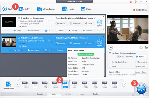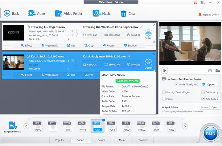 VideoProc Converter AI can be a go-to choice for most users, although there are many options on the market. Novice users can benefit from the rich presets and one-click operation; experienced users have all the freedom to customize the output MOV video files, such as setting video codec, resolution, bit rate, etc. Powered by GPU acceleration, the conversion process would be lightning fast without compromising quality.