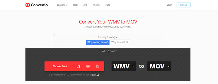 Convertio is another WMV converter that does work. It is similar in function to CloudConvert, and also supports the conversion of archives, ebooks, videos, and other file formats. Apart from the 100MB file size limit and the inconspicuous ads on the interface, it can still get the job done.