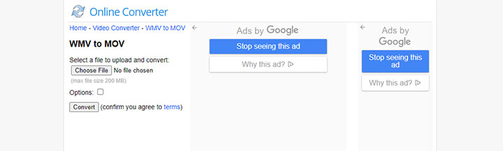 Compared with the previous online converters, OnlineConverter has more ads on the interface and does not support uploading video files from Google Drive or Dropbox. However, you can upload WMV videos up to 200MB with OnlineConverter. Other options during conversion are only to cut the video clip. And you can't set the audio/video codec or upload multiple files at once for batch conversion.