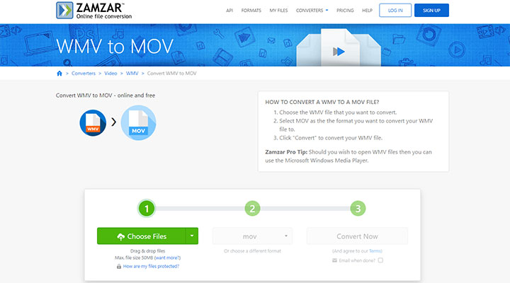 Want a quick and easy solution to convert WMV to MOV? There you go with Zamzar. It has a clean and understandable interface. Just upload the video, choose the output format, and download the converted file. That's it. But note that there's a file size limitation (50MB).