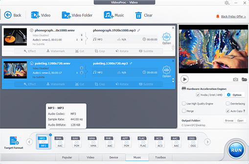 This program supports more than 420 codecs and file formats, including WMV and MP3. You can easily change WMV to MP3 and many other audio formats like WMA, FLAC, etc. With the GPU acceleration and Max-Quality engine, VideoProc Converter AI will deliver a buttery smooth WMV to MP3 conversion without losing quality.
