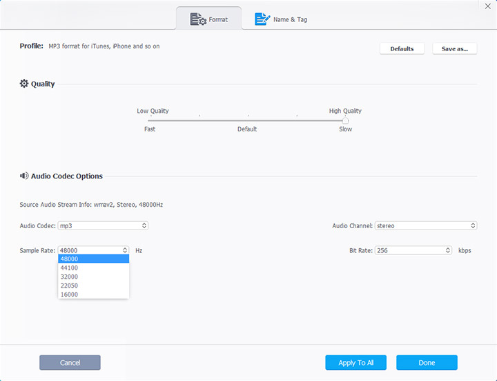 In the Format tab, you can set the audio codec, bit rate, sample rate, and audio channel. The higher the quality, the larger the audio file size will be. In the Name & Tag tab, you can edit the metadata and set the media cover for the output MP3 file.