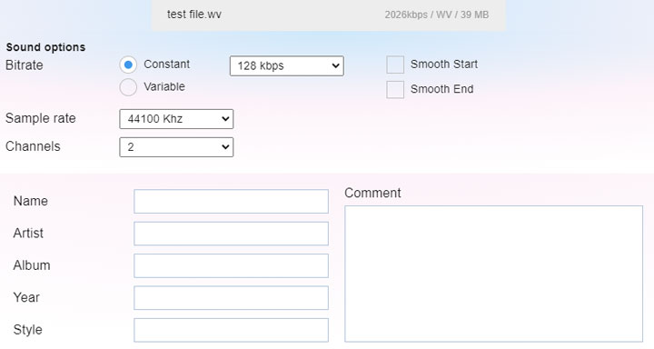 For users who want to convert small WV files to AVI online without installing extra software or plugin, online-audio-convert.com is a good option. This online service lets you convert WV files (under 2GB) to AVI straight on your browser. If you know what you're doing, you can customize output resolution, codec, bitrate, and other output settings. You're even allowed to edit the artist, album, year, and other metadata information of the AVI file turned from WV.