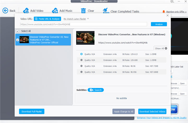 Step 3. Enter the URL link of YouTube music and hit Analyze. You'll see multiple download options with different extension (MP3, M4A), bitrate, and file size. Usually, the default selection has the largest file size, which provide best sound quality.