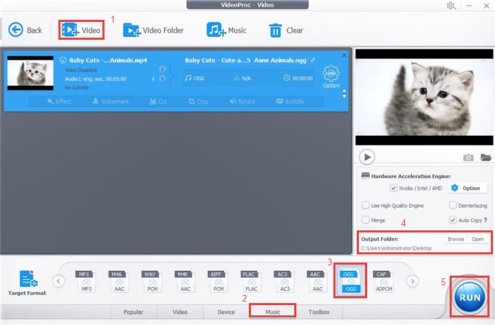 Step 4. At the bottom of this YouTube to OGG converter, find and select the OGG format under the Music column. If you can't find it, click on the Target Format feature for more options. Choose your preferred output folder path and click the RUN button to start converting YouTube to OGG.
