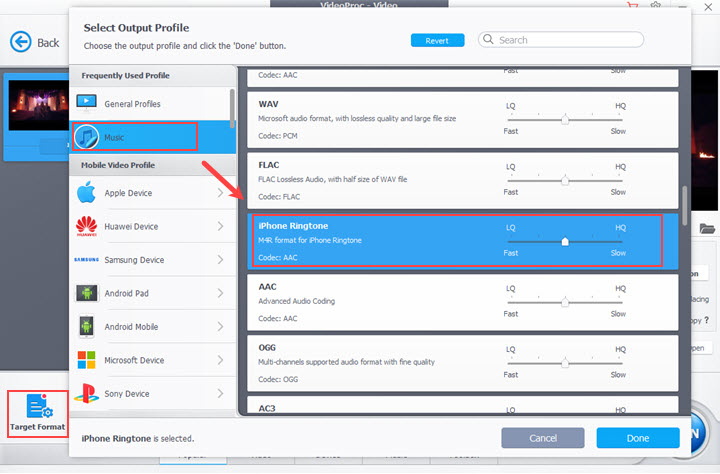 Reload this clip to VideoProc Converter AI. On the lower left side presents a "Target Format" option. You just need to click it and choose "Music" > "iPhone Ringtone" > "Done" > "RUN", then an iPhone ringtone will be created in seconds.