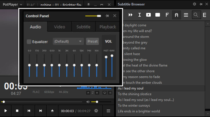 For AC3 files and other audio formats, KMPlayer has post-processing effects and an audio equalizer to enhance your listening experience. If you love a specific part of the audio or movie, you can use the A-B repeats feature in KMP. This media player also allows for network play and cloud play, streaming resources from FTP, SMB, UPNP, or songs and videos from online platforms.