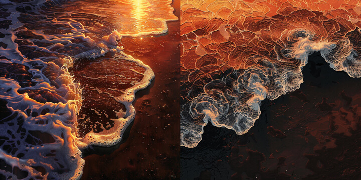 Prompt #1. A stunning digital painting of a shoreline with vibrant orange and red hues reflecting on the water. The waves are intricate and detailed, crashing onto the dark sand with white foam creating beautiful patterns. The overall style is abstract and highly detailed, capturing the contrast between the warm colors of the sunset and the dark, almost black sand