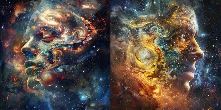 Prompt #11. A surreal portrait where the face is composed of swirling galaxies and stars, merging the human form with the cosmos, vibrant and ethereal, high definition