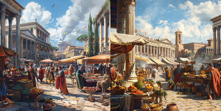 Prompt #12. A bustling marketplace in ancient Rome, with vendors selling goods, citizens in traditional Roman attire, and historical architecture, vibrant and detailed, high definition
