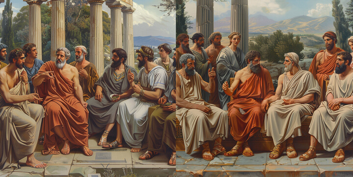 Prompt #13. Ancient Greek symposium with philosophers debating, participants in traditional togas, and classical architecture, vibrant and detailed, high definition