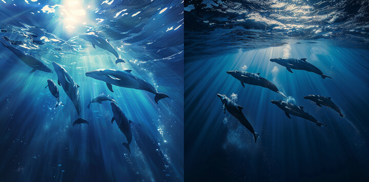 Prompt #14. A pod of whales swimming majestically through the ocean, with shafts of light penetrating the deep blue water, vibrant and awe-inspiring, high definition