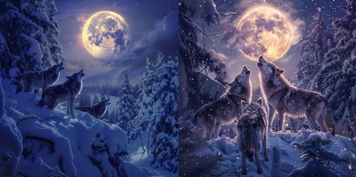 Prompt #15. A pack of wolves howling at the full moon in a snowy forest, with dramatic lighting and a mystical atmosphere, vibrant and powerful, high definition