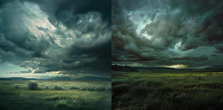 Prompt #19. A serene landscape with dark clouds gathering in the distance, capturing the mood of calm anticipation and impending change, high definition