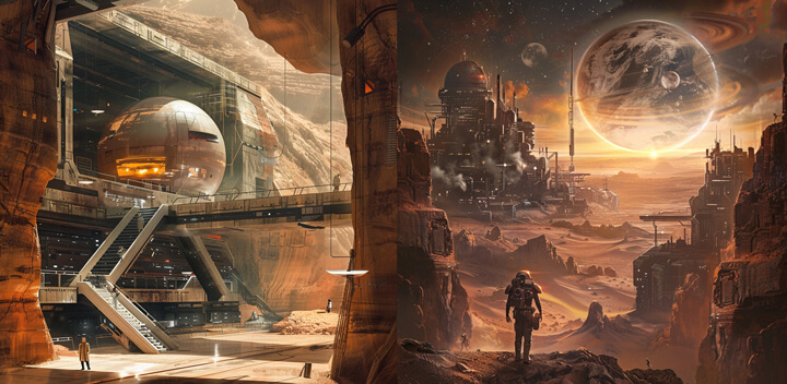 Prompt #25. Design futuristic scenes inspired by sci-fi literature like "Dune," "Neuromancer," or "The Martian," showcasing advanced technology and alien worlds