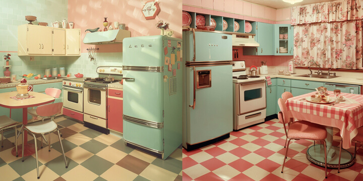 Prompt #26. Design a cozy kitchen scene from the 1950s, complete with pastel-colored appliances, checkered linoleum floors, and classic décor