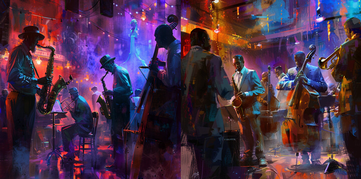 Prompt #30. Design a vibrant scene of a smoky jazz club with musicians playing saxophones, trumpets, and double bass, capturing the lively and spontaneous spirit of jazz