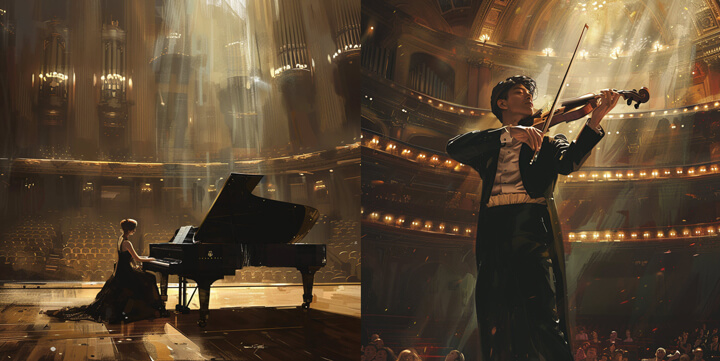 Prompt #31. Illustrate a classical pianist or violinist in a grand concert hall, emphasizing the elegance and refinement of classical music