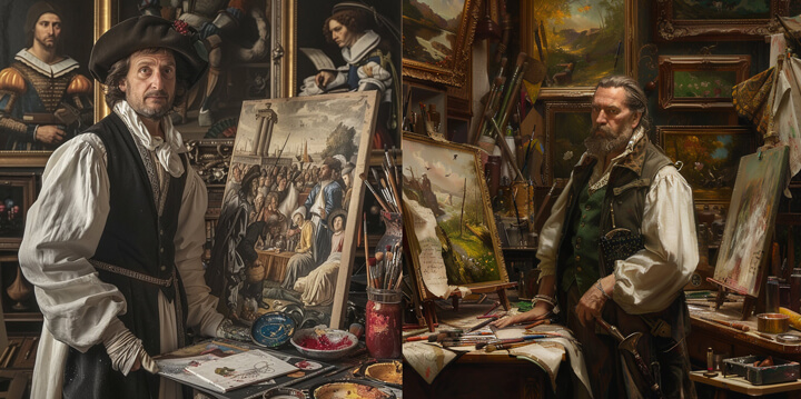 Prompt #7. Renaissance artist in his studio, surrounded by canvases and art supplies, with a thoughtful expression, historical style, detailed and vibrant