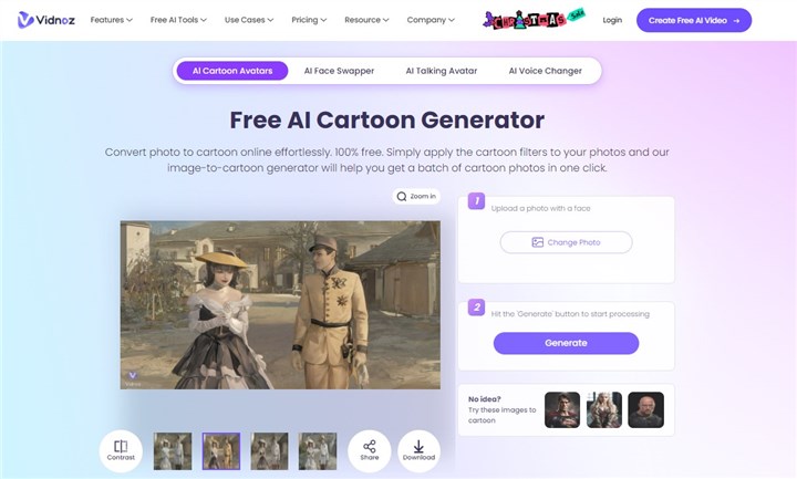 Vidnoz AI cartoon generator provides a simple and effective way to transform your images into cartoons. It helps create high-quality images and cartoons with hundreds of AI templates in different languages and accents. With its intuitive interface and quick processing speed, the Vidnoz AI cartoon generator is a convenient choice for users looking for an easy solution to turn photos into cartoons.