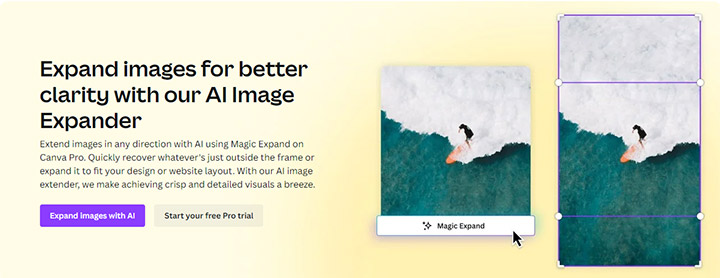 Canva is a free-to-use online graphic editor. It integrates Magic Expand to allow users to extend image with AI in any direction. It particularly excels at fixing awkward framing, transforming a zoomed-in image, or converting a vertical shot into a horizontal one. It can quickly recover parts of the image outside the frame, enhancing the image for better clarity and fitting it into various design layouts.