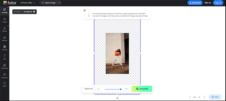Fotor is a popular online photo editing platform. The AI Image Extender of Fotor is an excellent tool for users looking for a quick and efficient way to enhance their images. Compared with the AI photo expander with big names, this AI photo editor is much easier to use but with fewer customization options. You can only drag the zoom-out slider to determine the fill size or choose the custom size option with the 2048x2048 maximum.