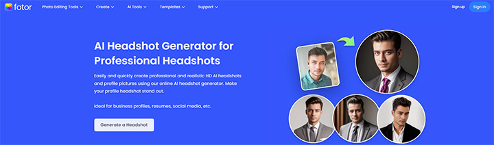 Fotor is a popular online photo editor among IG influencers and vloggers. Its AI image generator is designed to help create professional headshots effortlessly with advanced AI technology. It's designed to be user-friendly and efficient. You upload 4-15 qualified photos, select gender, and the AI will then create your headshot. However, please note that the AI is still under training. Features such as baldness, hairstyles, pupil and skin color, eyeglasses, and makeup may result in diverse appearances.
